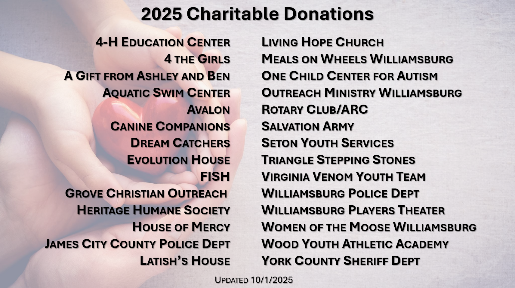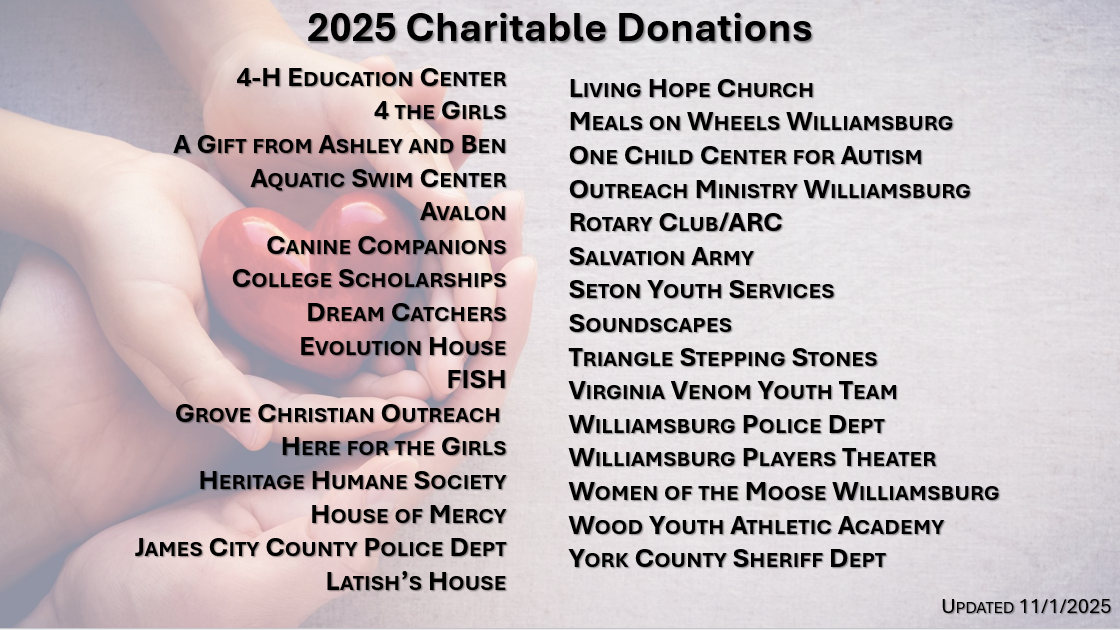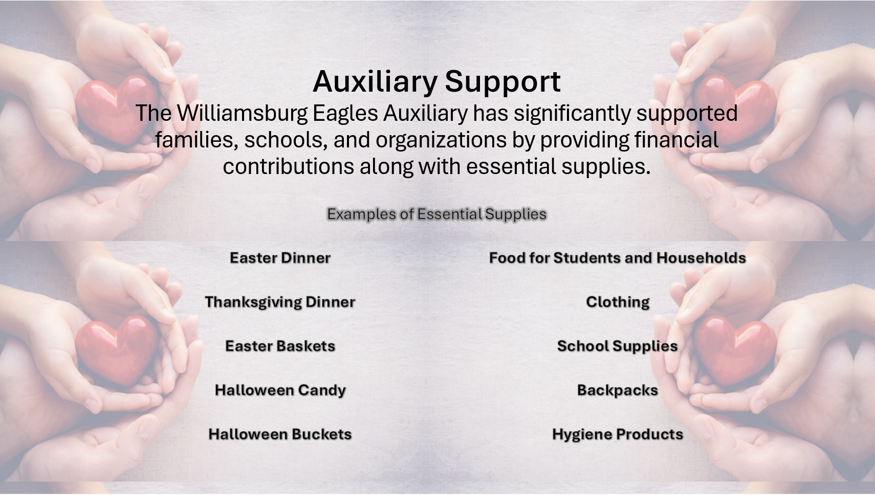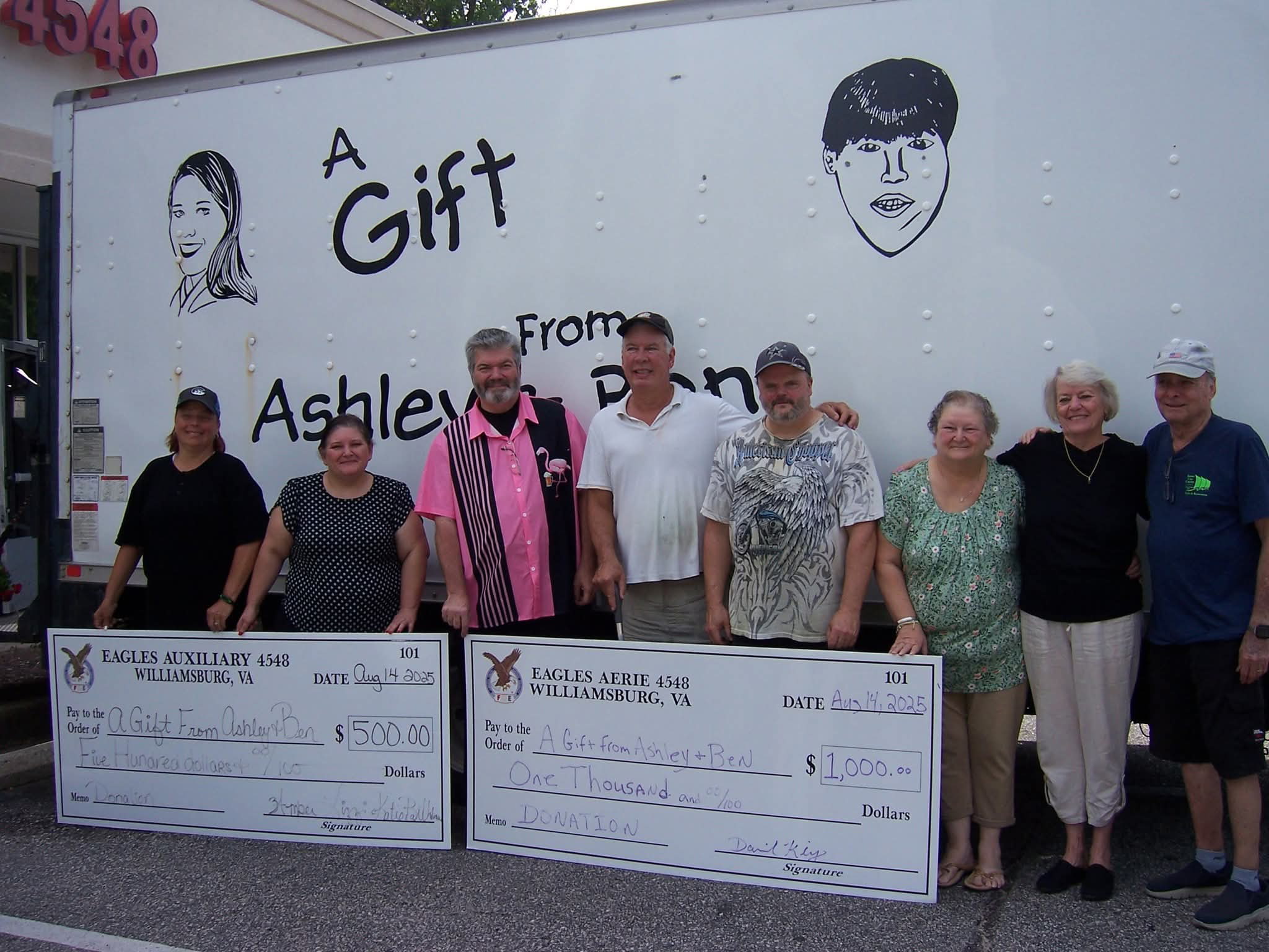 The Williamsburg Eagles 4548 are committed to helping the people in their community. The men and women of the Williamsburg Eagles work hard to make a difference. Please consider joining a great group of people helping people.