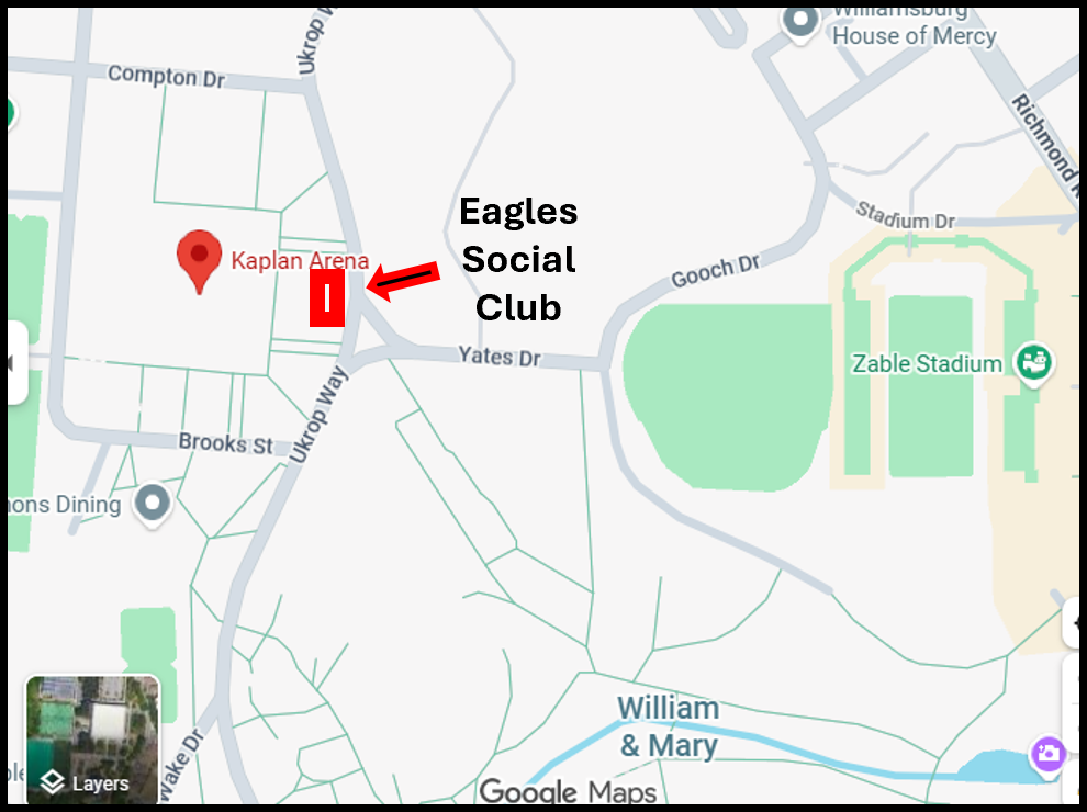 We will be tailgating on Saturday, Oct 18th from noon until 3:30pm on the lawn on the Kaplan Arena, near Ukrop Way and Yates Dr (photo above - arrow points to our tailgating location). We will be interacting with W&M Alumni, students, athletes, friends and families to cheer on a win for the Tribe football team's homecoming game.